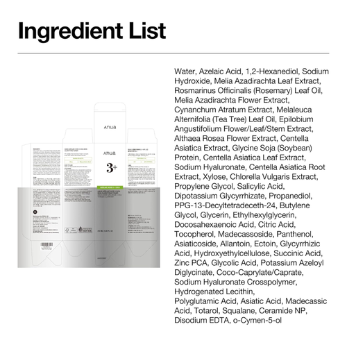 INGREDIENTS: Water, Azelaic Acid, 1,2-Hexanediol, Sodium Hydroxide, Propylene Glycol, Salicylic Acid, Dipotassium Glycyrrhizate, Propanediol, Ppg-13-Decyltetradeceth-24, Butylene Glycol, Disodium Edta, Melia Azadirachta Leaf Extract, Glycerin, Rosmarinus Officinalis (Rosemary) Leaf Oil, Melia Azadirachta Flower Extract, Cynanchum Atratum Extract, Melaleuca Alternifolia (Tea Tree) Leaf Oil, Epilobium Angustifolium Flower/Leaf/Stem Extract, Ethylhexylglycerin, Althaea Rosea Flower Extract, Docosahexaenoic Acid, Citric Acid, Tocopherol, Madecassoside, Centella Asiatica Extract, Panthenol, Glycine Soja (Soybean) Protein, Centella Asiatica Leaf Extract, Asiaticoside, Allantoin, Ectoin, Glycyrrhizic Acid, Hydroxyethylcellulose, Succinic Acid, Zinc Pca, O-Cymen-5-Ol, Sodium Hyaluronate, Glycolic Acid, Potassium Azeloyl Diglycinate, Coco-Caprylate/Caprate, Sodium Hyaluronate Crosspolymer, Centella Asiatica Root Extract, Hydrogenated Lecithin, Polyglutamic Acid, Xylose, Asiatic Acid, Madecassic Acid, Totarol, Squalane, Chlorella Vulgaris Extract, Ceramide NP