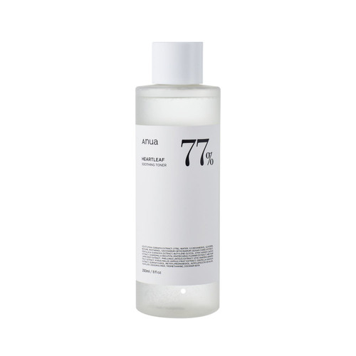 Anua Heartleaf 77% Soothing Toner refreshes, hydrates, and rejuvenates skin with heartleaf extract. Benefits include soothing, hydrating, and strengthening the skin’s natural barrier. Free from harmful chemicals. Made in Korea.