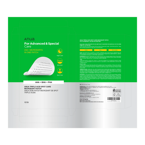 Anua Triple Acid Spot Care Microdart Patch delivers targeted treatment with microdarts and AHA, BHA, and PHA. Benefits sensitive skin with gentle exfoliation and pore control.