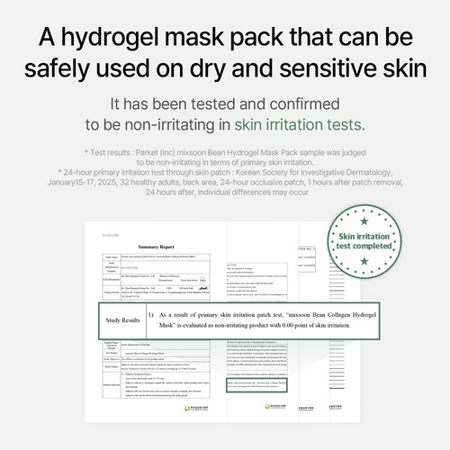 Mixsoon Bean Collagen Hydrogel Mask brightens, hydrates, improves elasticity, and soothes skin. Suitable for sensitive skin and cruelty-free. Made in Korea.